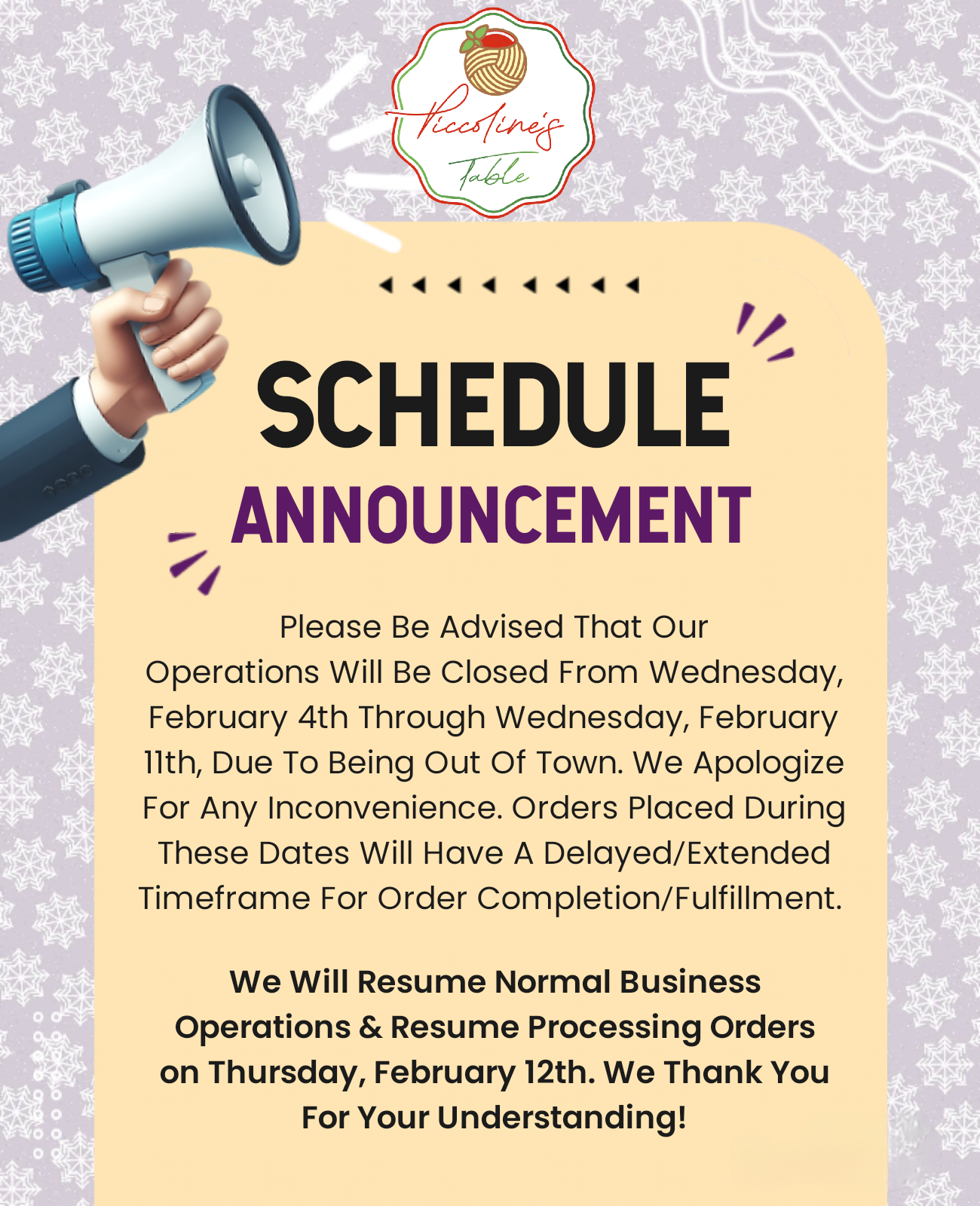 Orders placed from Wednesday, February 4th through Wednesday, February 11th will begin to be processed on THURSDAY, FEBRUARY 12TH.